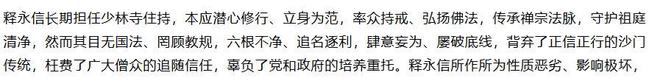 文中称:释永信本应潜心修行、立身为范,率众持戒、弘扬佛法,传承禅宗法脉,守护祖庭清净。