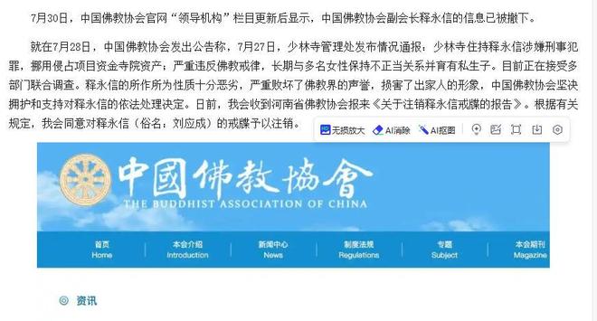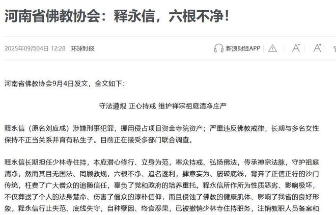 佛教协会此次发文指出,释永信的所作所为不仅严重破坏了少林寺的内部管理秩序,扰乱了佛教领域正常生态。