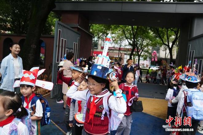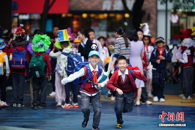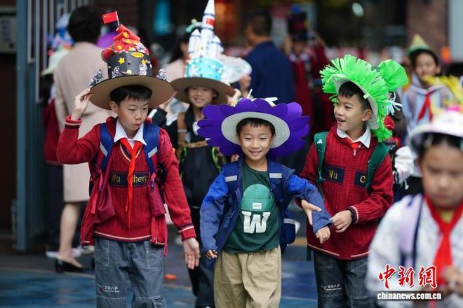 9月1日,昆明市中小学迎来新学期第一天。昆明市武成小学的孩子们戴着自己设计、制作的创意帽子返回校园,以“从头开始”的寓意迎接新学期。图为小朋友返回校园。中新社记者 刘冉阳 摄