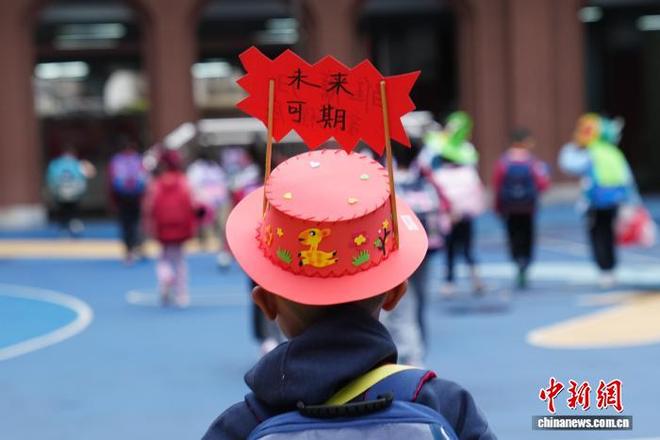 9月1日,昆明市中小学迎来新学期第一天。昆明市武成小学的孩子们戴着自己设计、制作的创意帽子返回校园,以“从头开始”的寓意迎接新学期。图为一名小朋友帽子上写着未来可期。中新社记者 刘冉阳 摄