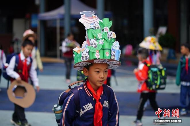 9月1日,昆明市中小学迎来新学期第一天。昆明市武成小学的孩子们戴着自己设计、制作的创意帽子返回校园,以“从头开始”的寓意迎接新学期。图为小朋友头戴熊猫主题的帽子入校。中新社记者 刘冉阳 摄