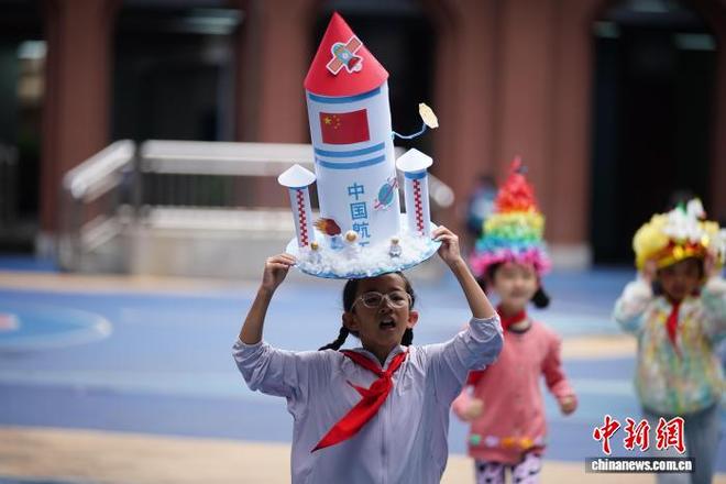 9月1日,昆明市中小学迎来新学期第一天。昆明市武成小学的孩子们戴着自己设计、制作的创意帽子返回校园,以“从头开始”的寓意迎接新学期。图为一名小朋友制作的中国航天主题帽子。中新社记者 刘冉阳 摄