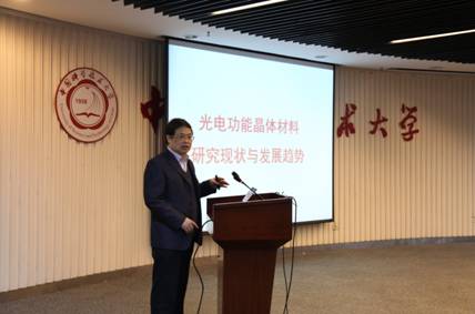 吴以成院士在致辞中感谢各位领导及参加仪式的所有老师,他指出,作为科大校友,自己非常荣幸能够为母校的发展贡献自己的力量。授聘仪式结束后,吴院士为材料科学与工程系师生做了“光电功能晶体材料研究现状及发展趋势”的学术报告。