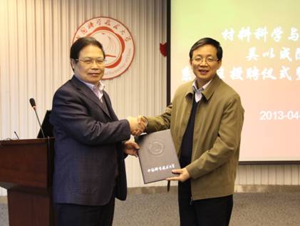 4月1日上午,中国工程院院士、中国科学院理化技术研究所研究员、我校近代化学系校友吴以成院士接受我校聘请,兼任我校化学与材料科学学院材料科学与工程系系主任。授聘仪式暨学术报告在微尺度国家实验室(筹)科技报告厅举行。我校校长侯建国院士、化学与材料科学学院执行院长杨金龙教授、材料科学与工程系执行主任陆亚林教授及材料系部分师生出席聘任仪式。